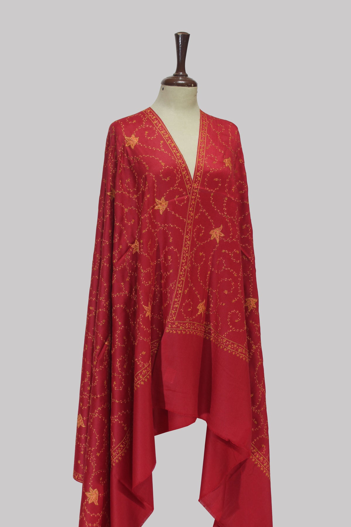 The embroidery is symmetrical and dense, reflecting skilled artisan work native to Kashmir.