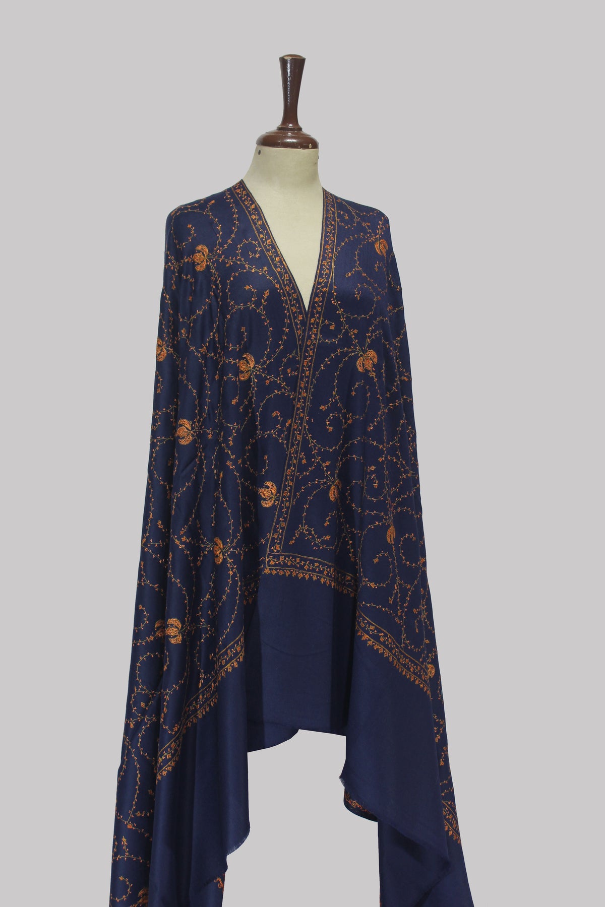 Elevate your traditional wardrobe with the Midnight Vines Kashmiri Wool Shawl. This statement piece features a luxurious black woolen base adorned with warm, rust-colored embroidery in ornate vine and floral patterns. Whether paired with ethnic attire or draped over a formal evening dress, this shawl embodies heritage, craftsmanship, and timeless sophistication.