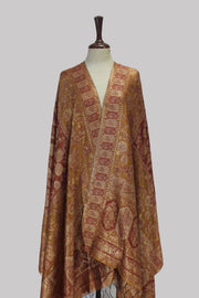 The shawl features a rich blend of warm golden and red hues. The gold detailing along the edges and floral motifs enhances the overall design, creating an elegant and luxurious appearance.